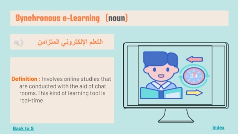 Synchronous e-Learning (noun) Index اﻟﺘﻌﻠﻢ اﻹﻟﻜﺘﺮوﻧﻲ اﻟﻤﺘﺰاﻣﻦ Definition : Involves online studies that are conducted with the aid of chat rooms.This kind of learning tool is real-time. Back to S