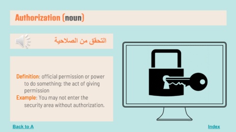 Authorization (noun) Index اﻟﺘﺤﻘﻖ ﻣﻦ اﻟﺼﻼﺣﯿﺔ Definition: official permission or power to do something; the act of giving permission Example: You may not enter the security area without authorization. Back to A