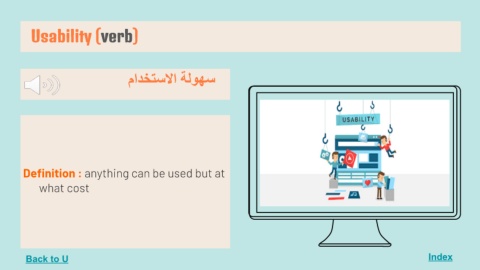 Usability (verb) Index ﺳﮭﻮﻟﺔ اﻻﺳﺘﺨﺪام Definition : anything can be used but at what cost Back to U