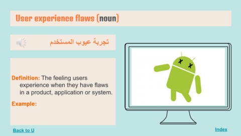 User experience flaws (noun) Index ﺗﺠﺮﺑﺔ ﻋﯿﻮب اﻟﻤﺴﺘﺨﺪم Definition: The feeling users experience when they have flaws in a product, application or system. Example: Back to U