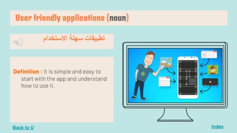User friendly applications (noun) Index ﺗﻄﺒﯿﻘﺎت ﺳﮭﻠﺔ اﻻﺳﺘﺨﺪام Definition : It is simple and easy to start with the app and understand how to use it. Back to U