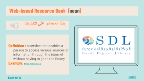 Web-based Resource Bank (noun) Index ﺑﻨﻚ اﻟﻤﺼﺎدر ﻋﻠﻰ اﻻﻧﺘﺮﻧﺖ Definition : a service that enables a person to access various sources of information through the internet without having to go to the library . Example: https://sdl.edu.sa/ Back to W