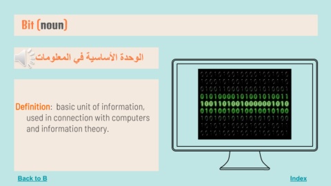 Bit (noun) Index اﻟﻮﺣﺪة اﻷﺳﺎﺳﯿﺔ ﻓﻲ اﻟﻤﻌﻠﻮﻣﺎت Definition: basic unit of information, used in connection with computers and information theory. Back to B