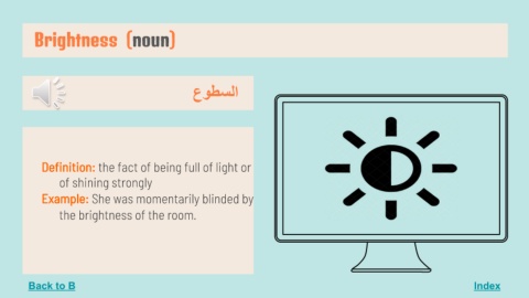Brightness (noun) Index اﻟﺴﻄﻮع Definition: the fact of being full of light or of shining strongly Example: She was momentarily blinded by the brightness of the room. Back to B