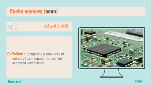 Cache memory (noun) Index اﻟﺬاﻛﺮة اﻟﻤﺆﻗﺘﺔ Definition : computing a small area of memory in a computer that can be accessed very quickly Back to C