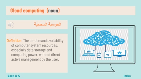 Cloud computing (noun) Index اﻟﺤﻮﺳﺒﺔ اﻟﺴﺤﺎﺑﯿﺔ Definition: The on-demand availability of computer system resources, especially data storage and computing power, without direct active management by the user. Back to C