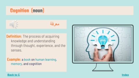 Cognition (noun) Index ﻣﻌﺮﻓﺔ Definition: The process of acquiring knowledge and understanding through thought, experience, and the senses. Example: a book on human learning, memory, and cognition Back to C