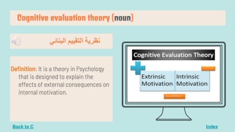 Cognitive evaluation theory (noun) Index ﻧﻈﺮﯾﺔ اﻟﺘﻘﯿﯿﻢ اﻟﺒﻨﺎﺋﻲ Definition: It is a theory in Psychology that is designed to explain the effects of external consequences on internal motivation. Back to C