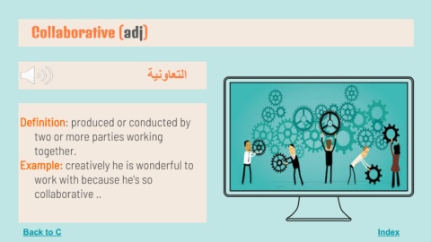 Collaborative (adj) Index اﻟﺘﻌﺎوﻧﯿﺔ Definition: produced or conducted by two or more parties working together. Example: creatively he is wonderful to work with because he's so collaborative .. Back to C