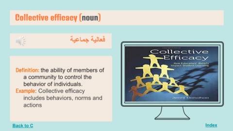 Collective efficacy (noun) Index ﻓﻌﺎﻟﯿﺔ ﺟﻤﺎﻋﯿﺔ Definition: the ability of members of a community to control the behavior of individuals. Example: Collective efficacy includes behaviors, norms and actions Back to C