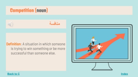 Competition (noun) Index ﻣﻨﺎﻓﺴﺔ Definition: A situation in which someone is trying to win something or be more successful than someone else. Back to C
