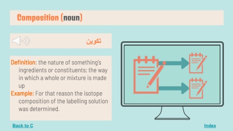 Composition (noun) Index ﺗﻜﻮﯾﻦ Definition: the nature of something's ingredients or constituents; the way in which a whole or mixture is made up Example: For that reason the isotope composition of the labelling solution was determined. Back to C