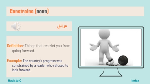 Constrains (noun) Index ﻋﻮاﺋﻖ Definition: Things that restrict you from going forward. Example: The country's progress was constrained by a leader who refused to look forward. Back to C
