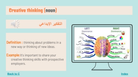 Creative thinking (noun) Index اﻟﺘﻔﻜﯿﺮ اﻹﺑﺪاﻋﻲ Definition : thinking about problems in a new way or thinking of new ideas. Example:It's important to share your creative thinking skills with prospective employers. Back to C