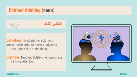 Critical thinking (noun) Index اﻟﺘﻔﻜﯿﺮ اﻟﻨﺎﻗﺪ Definition : Evaluate the solutions presented in order to make a judgment about the value of the thing. Example: Teaching bolsters her own critical thinking skills, too.’ Back to C