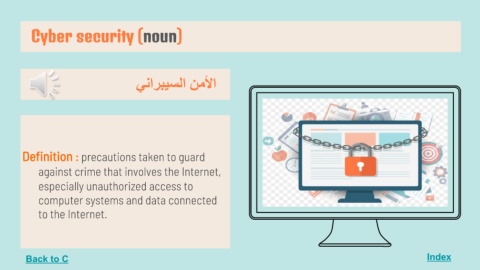 Cyber security (noun) Index اﻷﻣﻦ اﻟﺴﯿﺒﺮاﻧﻲ Definition : precautions taken to guard against crime that involves the Internet, especially unauthorized access to computer systems and data connected to the Internet. Back to C