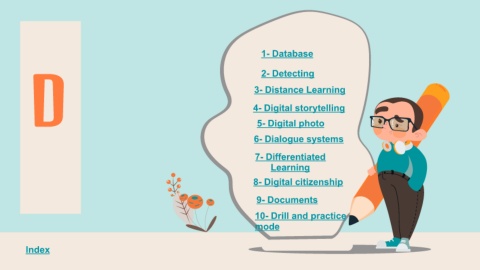 D 1- Database Index 2- Detecting 3- Distance Learning 4- Digital storytelling 5- Digital photo 6- Dialogue systems 7- Differentiated Learning 8- Digital citizenship 9- Documents 10- Drill and practice mode