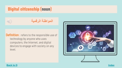 Digital citizenship (noun) Index اﻟﻤﻮاطﻨﺔ اﻟﺮﻗﻤﯿﺔ Definition : refers to the responsible use of technology by anyone who uses computers, the Internet, and digital devices to engage with society on any level. Back to D