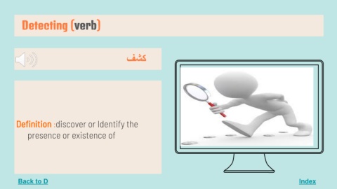 Detecting (verb) ﻛﺸﻒ Definition :discover or Identify the Index presence or existence of Back to D