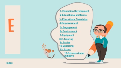E 1- Education Development 2-Educational platforms Index 3- Educational Television 4-Empowerment 5- Engagement 6- Environment 7-Equipment 8-E-Tutoring 9- Evolve 10-Exploring 11- Export 12-Extracurricular initiative