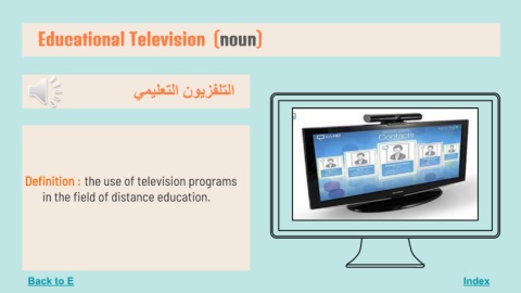 Educational Television (noun) Index اﻟﺘﻠﻔﺰﯾﻮن اﻟﺘﻌﻠﯿﻤﻲ Definition : the use of television programs in the field of distance education. Back to E