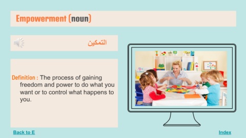 Empowerment (noun) Index اﻟﺘﻤﻜﯿﻦ Definition : The process of gaining freedom and power to do what you want or to control what happens to you. Back to E