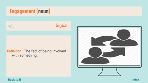 Engagement (noun) Index اﻧﺨﺮاط Definition : The fact of being involved with something. Back to E