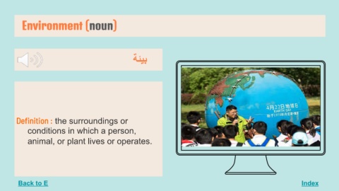 Environment (noun) Index ﺑﯿﺌﺔ Definition : the surroundings or conditions in which a person, animal, or plant lives or operates. Back to E