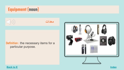 Equipment (noun) Index ﻣﻌﺪات Definition : the necessary items for a particular purpose. Back to E