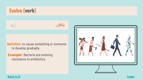 Evolve (verb) ﯾﺘﻄﻮر Definition: to cause something or someone to develop gradually. Example: Bacteria are evolving resistance to antibiotics. Back to E Index