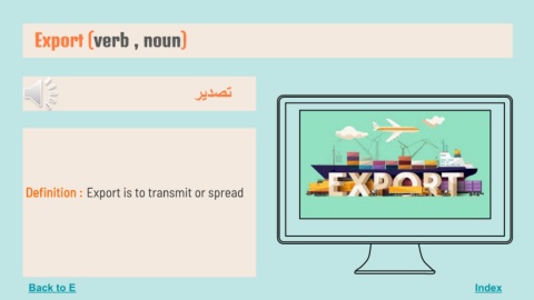 Export (verb , noun) Index ﺗﺼﺪﯾﺮ Definition : Export is to transmit or spread Back to E
