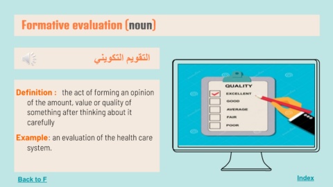 Formative evaluation (noun) Index اﻟﺘﻘﻮﯾﻢ اﻟﺘﻜﻮﯾﻨﻲ Definition : the act of forming an opinion of the amount, value or quality of something after thinking about it carefully Example: an evaluation of the health care system. Back to F