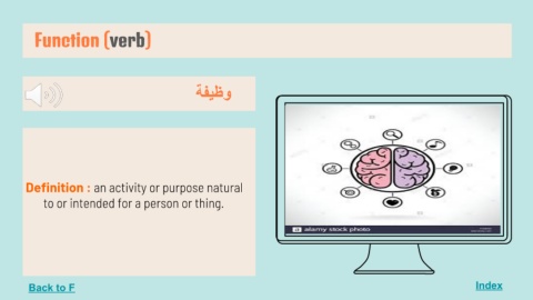 Function (verb) وظﯿﻔﺔ Definition : an activity or purpose natural Index to or intended for a person or thing. Back to F