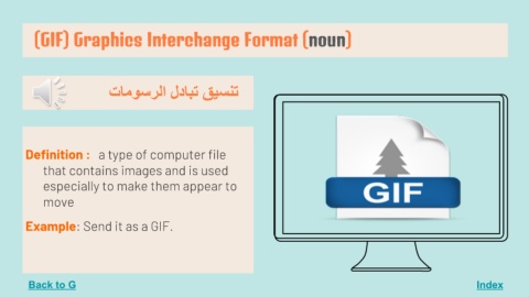 (GIF) Graphics Interchange Format (noun) Index ﺗﻨﺴﯿﻖ ﺗﺒﺎدل اﻟﺮﺳﻮﻣﺎت Definition : a type of computer file that contains images and is used especially to make them appear to move Example: Send it as a GIF. Back to G