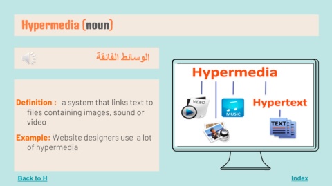 Hypermedia (noun) Index اﻟﻮﺳﺎﺋﻂ اﻟﻔﺎﺋﻘﺔ Definition : a system that links text to files containing images, sound or video Example: Website designers use a lot of hypermedia Back to H