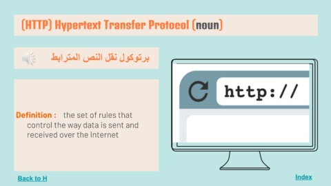 (HTTP) Hypertext Transfer Protocol (noun) Index ﺑﺮﺗﻮﻛﻮل ﻧﻘﻞ اﻟﻨﺺ اﻟﻤﺘﺮاﺑﻂ Definition : the set of rules that control the way data is sent and received over the Internet Back to H