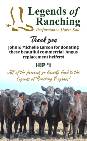 Thank you John & Michelle Larson for donating these beautiful commercial Angus replacement heifers! HIP 1 # All of the proceeds go directly back to the Legends of Ranching Program! © John & Michelle Larson 19