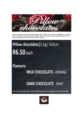 We can supply you with our pillow chocolates. They are made from Belgian chocolate that is Forest Alliance and UTZ certified thus fairly sourced and placing value on the chain of people from the farmers to the pickers. 4