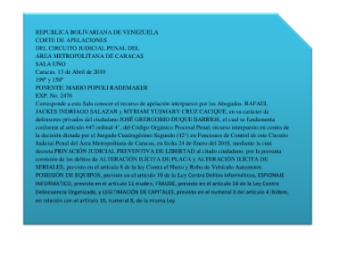 Judicial Penal del Área Metropolitana de Caracas, en fecha 24 de Enero del 2010, mediante la cual