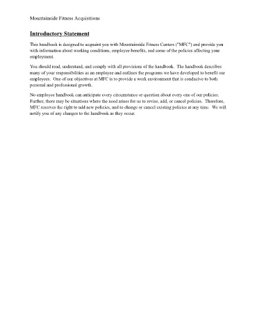 This handbook is designed to acquaint you with Mountainside Fitness Centers ("MFC") and provide you