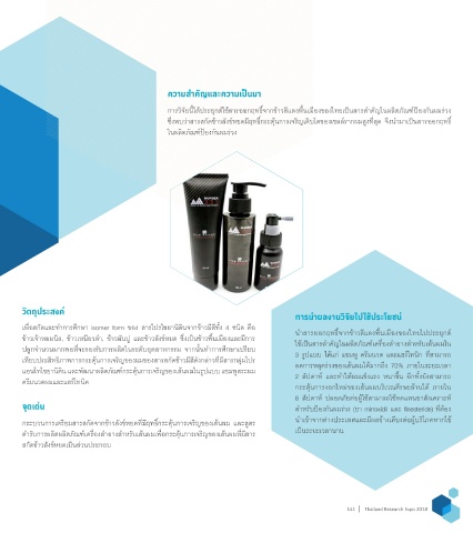 การวิจัยนี้ได้ประยุกต์ใช้สารออกฤทธิ์จากข้าวสีแดงพื้นเมืองของไทยเป็นสารสำาคัญในผลิตภัณฑ์ป้องกันผมร่วง