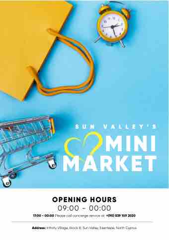 SUN VALLEY’S MINI MARKET OPENING HOURS 09:00 - 00:00 17:00 - 00:00 Please call concierge service at: +(90) 539 109 2020 Address: Infinity Village, block B, Sun Valley, Esentepe, North Cyprus