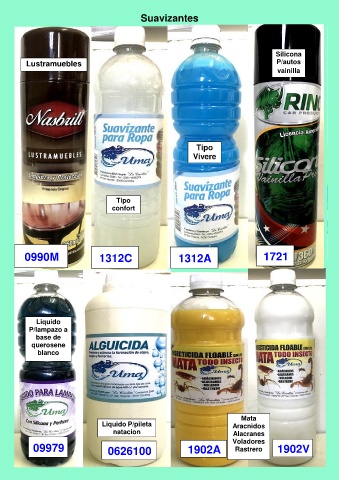 Suavizantes Silicona Lustramuebles P/autos vainilla Tipo Vivere Tipo confort 0990M 1312C 1312A 1721 0990M Liquido P/lampazo a base de querosene blanco Mata Liquido P/pileta Aracnidos natacion Alacranes Voladores 09979 0626100 1902A Rastrero 1902V