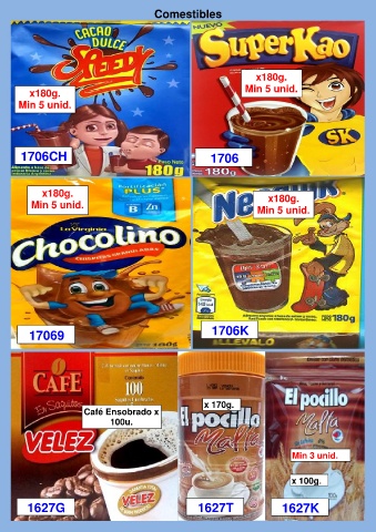 Comestibles x180g. Min 5 unid. x180g. Min 5 unid. 1706CH 1706 x180g. x180g. Min 5 unid. Min 5 unid. 17069 1706K x 170g. Café Ensobrado x 100u. Min 3 unid. x 100g. 1627G 1627T 1627K