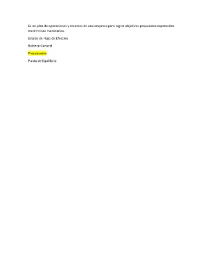 Es un plan de operaciones y recursos de una empresa para lograr objetivos propuestos expresados en términos monetarios. Estado de Flujo de Efectivo Balance General Presupuesto Punto de Equilibrio