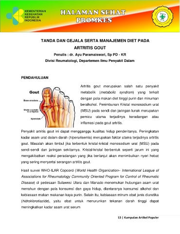 gout. Masalah akan timbul jika terbentuk kristal-kristal monosodium urat (MSU) pada