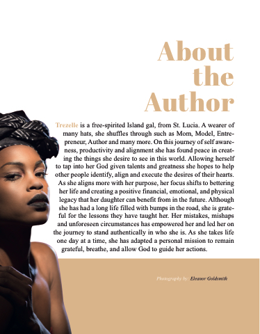 Trezelle is a free-spirited Island gal, from St. Lucia. A wearer of many hats, she shuffles through such as Mom, Model, Entre- preneur, Author and many more. On this journey of self aware- ness, productivity and alignment she has found peace in creat- ing the things she desire to see in this world. Allowing herself to tap into her God given talents and greatness she hopes to help other people identify, align and execute the desires of their hearts. As she aligns more with her purpose, her focus shifts to bettering her life and creating a positive financial, emotional, and physical legacy that her daughter can benefit from in the future. Although she has had a long life filled with bumps in the road, she is grate- ful for the lessons they have taught her. Her mistakes, mishaps and unforeseen circumstances has empowered her and led her on the journey to stand authentically in who she is. As she takes life one day at a time, she has adapted a personal mission to remain