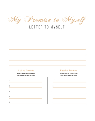 My Promise to Myself Letter to Myself Active Income Income made from active work (write down income streams) 11 22 33 44 55 Passive Income Income after the work is done (write down income streams)