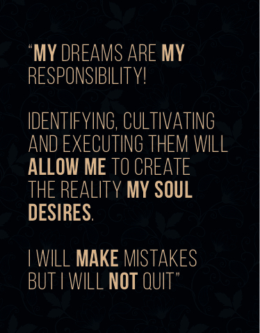 “My dreams are my responsibility! Identifying, cultivating and executing them will allow me to create the reality my soul desires. I will make mistakes but I will NOT quit”