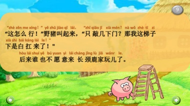 9 “zhè zěn me xínɡ!” yě zhū jiào qǐ lái, “zhǐ qiāo jǐ xià mén? nà wǒ zhè tī zi “这怎么 行!”野猪叫起来,“只 敲几下门?那我这梯子 xià shì bái kánɡ lái le!" 下是白 扛 来了!" hòu lái shuí yě bú yuan yì lái chánɡ jǐnɡ lù jiā wánr le. 后来谁 也不 愿 意来 长 颈鹿家玩儿了。